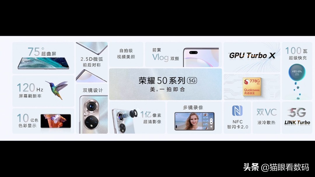 荣耀50的外观和配置基本上和荣耀50 Pro保持一致,都是75°曲面屏、1亿像素主摄、高通骁龙778G处理器。主要区别之处在于,荣耀50是前置单摄,只有1颗3200万像素的前置主摄,居中开孔。