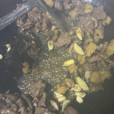 4、锅内加入油烧开,放入驴肉?姜片?蒜果,爆炒至断生,加入豆瓣酱?盐?五香粉,继续爆炒