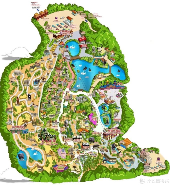 我们着重来说说空中缆车。广州长隆动物世界里一共有三个缆车站点,分别是熊猫乐园站、天鹅湖站和非洲草原站,三个站点连接成一个三角形,算是覆盖了园区大部分区域也是最为精华的区域。坐在缆车上游览,能够从“上帝视角”观赏各种动物,这在其他动物园是很难体验到的。需要注意的是,缆车有环线(中间站点不停)和单程线,按各位游览目的选择不要走错道了。