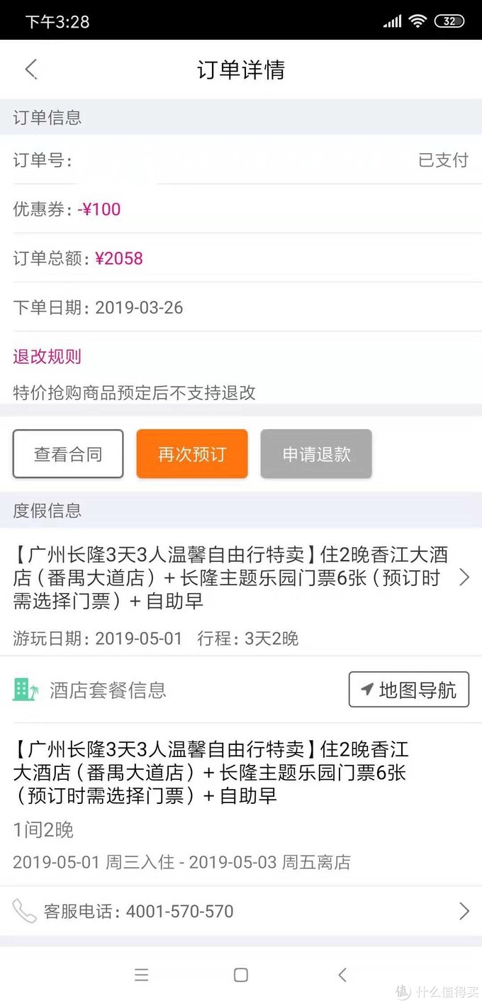 再附上两个良心提示:一、确定好出游日期后,尽量早些预定。从前面那张订单可以看到我是3月26下单的五一三人酒景套餐,一开始出游人数还没确定我也只订了这一个。等过两天再想买一个两人套餐的时候,发现价格就开始涨了,而且几乎每天都在涨,甚至到了后面五一期间的套餐都不卖了。二、关于购买渠道。主流的旅游出行平台我都搜索对比过,这里直接给结论,购买广州长隆的酒景套餐可以看看驴妈妈和飞猪。
