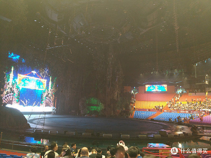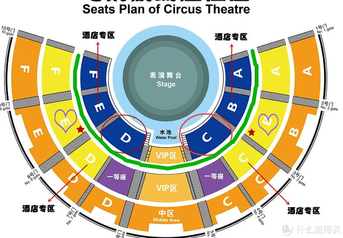 看上图,两个红圈C和D也是一等座区域。四个箭头标示的B、C、D、E为长隆旗下酒店专区,每个区域对应不同的酒店,箭头E那个酒店专区是番禺香江大酒店的区域。除掉VIP区、四个一等座区、四个酒店专区之外,其他的地方是普通座区域。中间画绿色线的是演出过程中的巡游互动路线。
