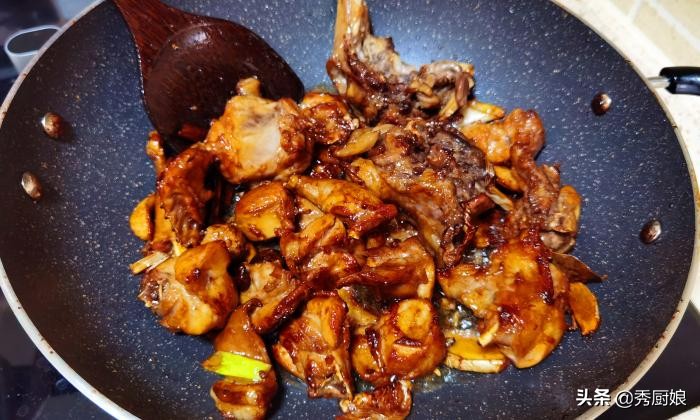 第四步:兔肉下锅后,要不停地翻炒,炒至兔肉完全上色,看着有点焦边后,加入适量的开水,水要没过兔肉,加入适量的料酒去腥,大火煮开后,盖上锅盖,转小火炖半个小时。