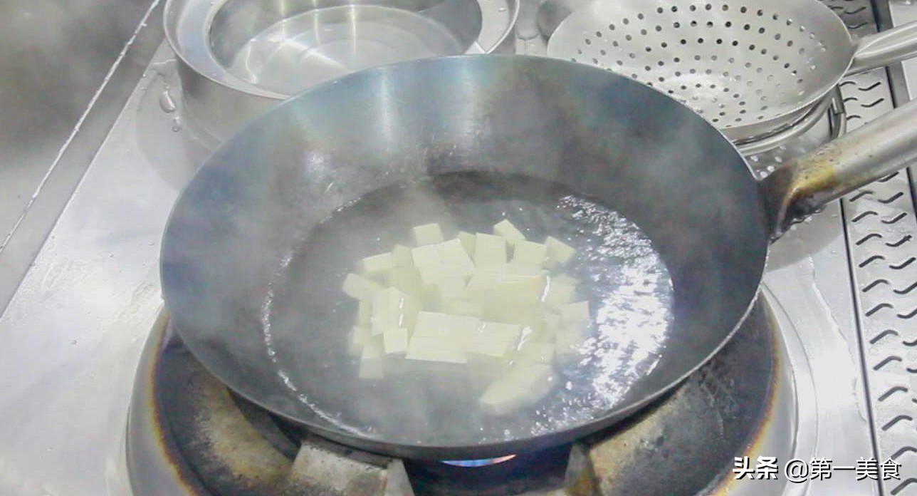 现在我们把豆腐块焯一下水,锅内倒入清水,加入两勺食盐,水开后倒入豆腐,焯水一分钟,,捞出沥干水分。