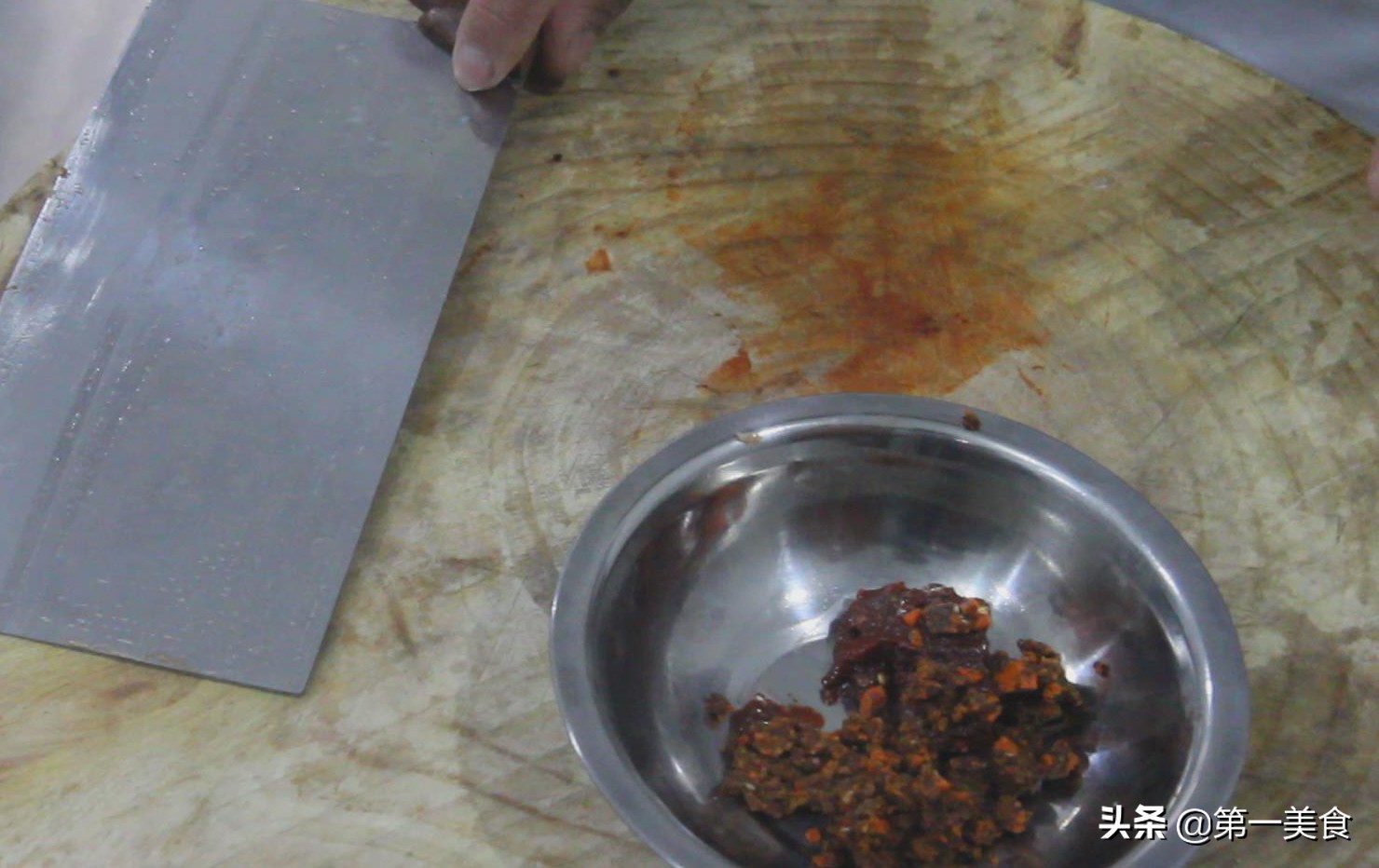 郫县豆瓣一勺,切成碎末,麻辣火锅底料一块,用刀切碎。