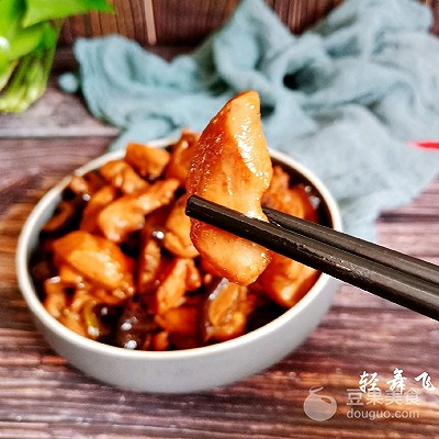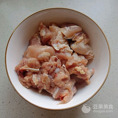 2、鸡腿处理干净,斩成小块儿。加入适量酱油腌制一小时,我用的是干香菇要提前泡发,