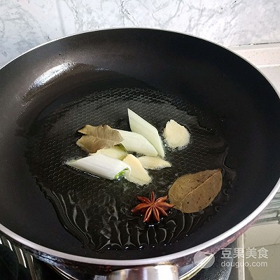 3、起锅,锅内放入适量食用油,放入葱花,姜片,八角,香叶煸出香味。