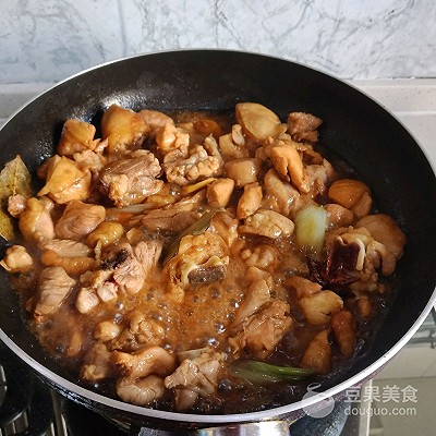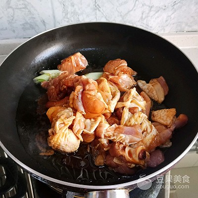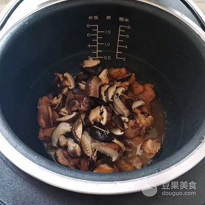 6、然后将鸡块儿倒入铁釜饭煲,加入适量料酒,加入切片的香菇,少许水,设置蒸煮15分钟,也可以用炒锅继续煮,时间和火候上自己掌握好。