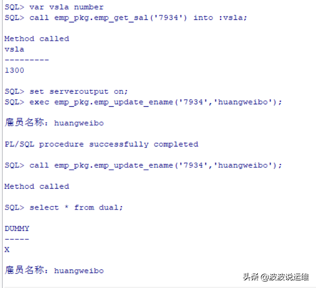 SQL> var vsla number SQL> call emp_pkg.emp_get_sal into :vsla; SQL> set serveroutput on; SQL> exec emp_pkg.emp_update_ename; SQL> call emp_pkg.emp_update_ename; SQL> select * from dual;