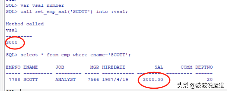 SQL> var vsal number SQL> call ret_emp_sal into :vsal; Method called vsal --------- 3000
