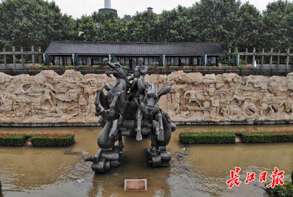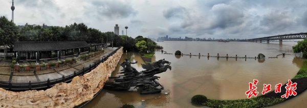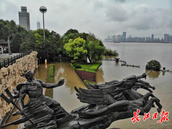 7月13日,汉阳江滩大禹神话园已被江水漫过。据悉,明天洪峰将抵达并通过武汉,长江水位仍呈上涨趋势。