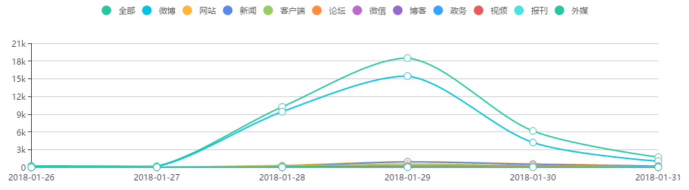 截至1月30日16时,公开网络平台涉及“黄河大合唱”的信息共3.3万多条,其中微博是主要传播渠道,相关微博2.8万多条,占比84%;网站1758条,占比5%;新闻1576条,外媒报道21条。梳理发现,舆论中提及的负面高频词依次为“恶搞”、“亵渎”、“维权”、“起诉”、“歪风”、“恶心”等。