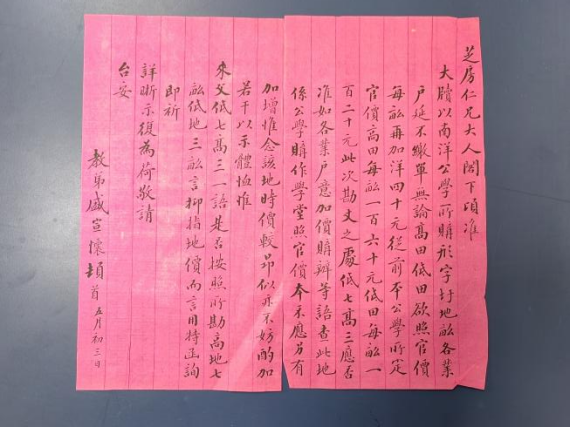 1902年6月,盛宣怀复函南洋公学总办汪凤藻。南洋公学所购形字圩地亩,原来谈定高田每亩160元,低田每亩120元。因几年下来田价上涨,原田主要求加价。盛宣怀复函中同意每亩加价若干。