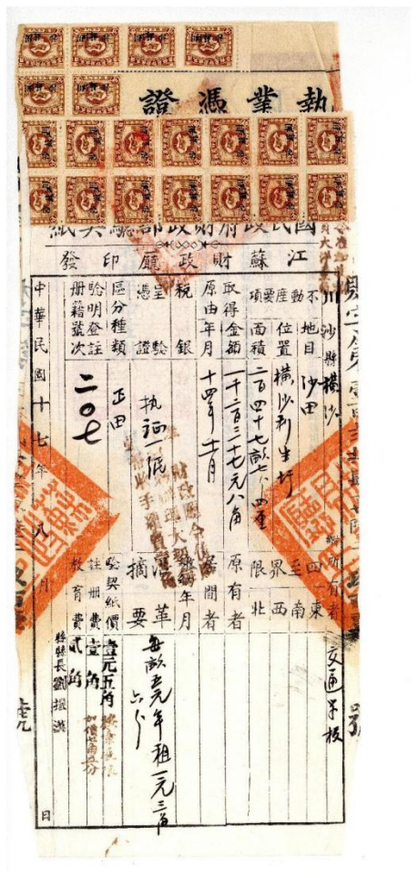 1901年,盛宣怀同意招商局呈请,将川沙横沙岛张炳华向通商银行抵押之滩田800亩,作为校产拨归南洋公学。1908年起,监督唐文治另派沙田管理员专事收租,但除去修围、开支等租息为数至微。该沙田于1930年代由交通大学出售。此为横沙沙田执业凭证。