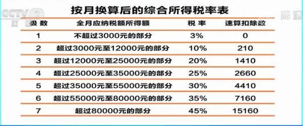 其中,速算扣除数和税率对应全月应纳税所得额,分7个档次,其中,全月应纳税所得额不超过3000元的,税率为3%,速算扣除数为0;超过3000元至12000元的部分,税率为10%,速算扣除数为210;最高的一档,也就是全月应纳税所得额超过80000元的部分,税率为45%,速算扣除数为15160。大家可以看看这个表格。以年终奖10万元为例,缴纳个税的算法为,100000?12=8333元,8333元使用现行税率表的10%税率。因此年终奖应交税:100000?10%-210=9790元。