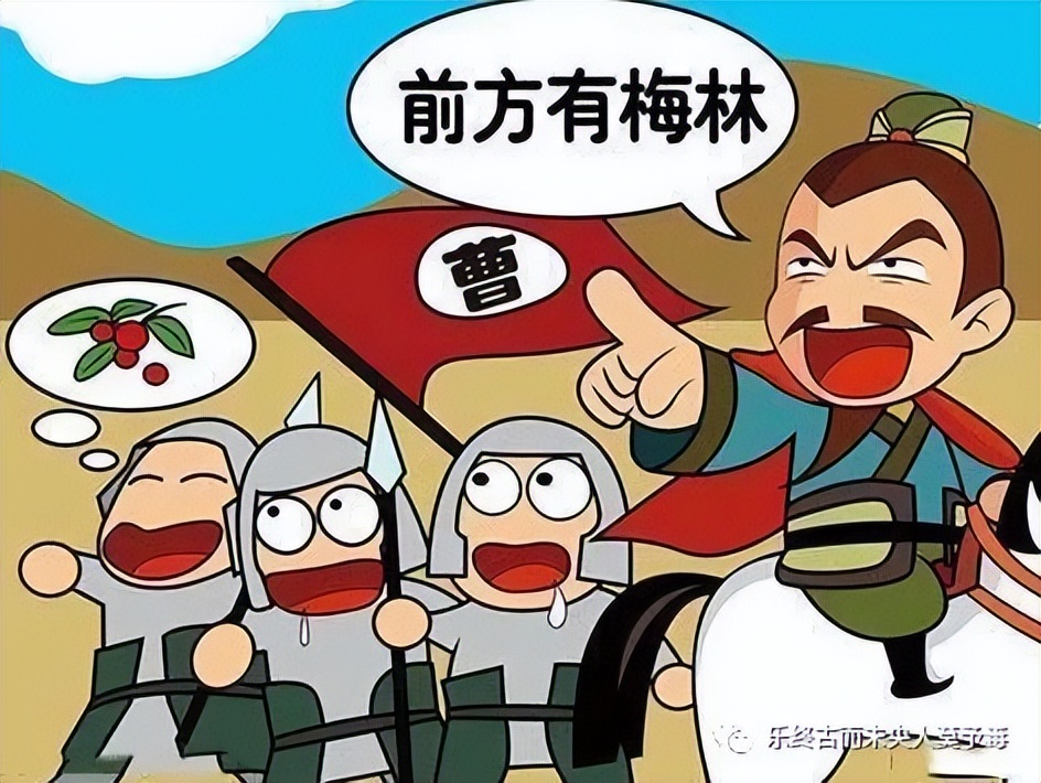 “乃令曰:&34; 前有大梅林,饶子,甘酸可以解渴。” 曹操欺骗士兵说“前方有一大片梅树林,果实累累,又酸又甜,可以解渴”,在《三国演义》中曹操请刘备来青梅煮酒论英雄,也有关于“望梅止渴”的描述,“操曰:适见枝头梅子青青,忽感去年征张绣时,道上缺水,将士皆渴,吾心生一计,以鞭虚指曰:前面有梅林。军士闻之,口皆生唾,由是不渴。”