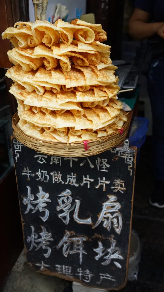 乳扇携带方便,造型特殊,食用也方便,烤、炸、凉吃均可,甜、咸都适宜。乳香沁脾,酥脆泡松,是下酒好菜,在大理街边小摊都有卖。