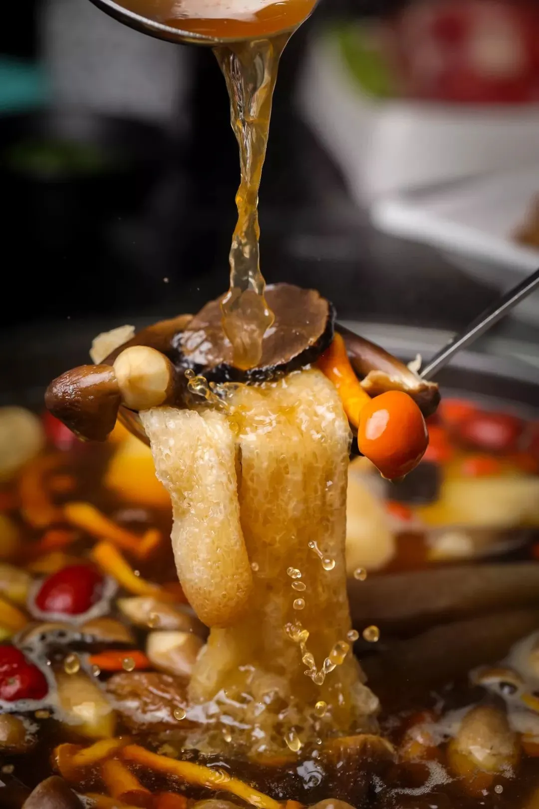 野生菌火锅采用老菌汤作为汤底,将7种以上野生菌干片,加上高钙骨料混合经7小时熬制而成。