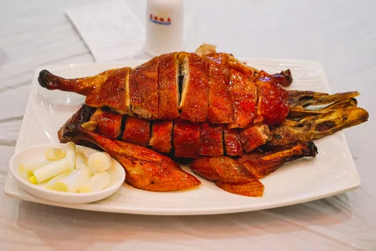 烤鸭肥瘦相宜,皮酥脆,内香嫩,光亮油润,色泽红艳,清香离骨,地方风味显著。