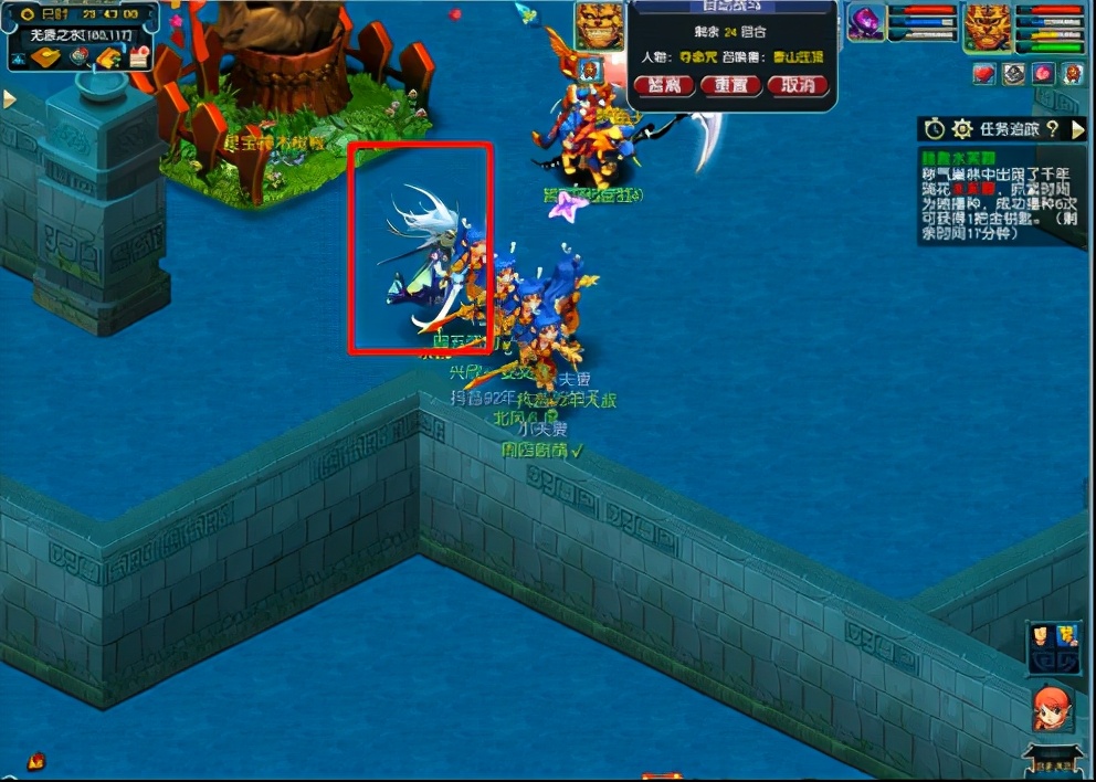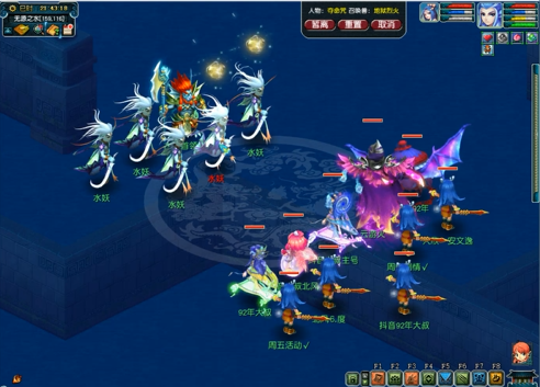 然后解散队伍5个号分开领取,记录坐标,到了下一层之后,到达对应坐标使用梦莲子即可进行战斗,也可以先队友使用梦莲子,这样场景中就会出现一个水妖,点击进入战斗即可,如此反复。