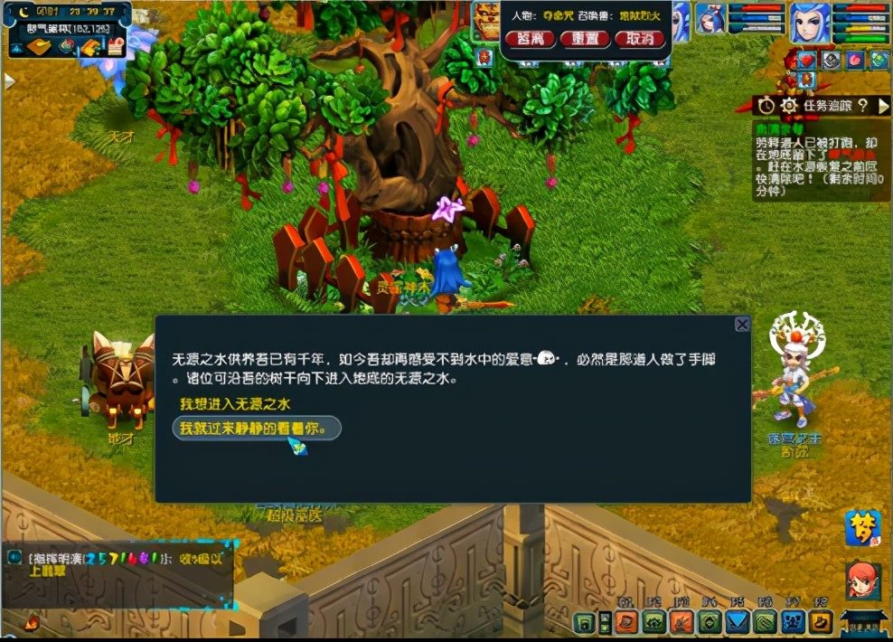 大约 在系统时间的8点10分左右帮派聊天频道会有提示,我们来到秽气巢林的左右上角的地图,寻找中箭的树精65535花妖造型),选择第一个选项,进入干涸的无源之水;