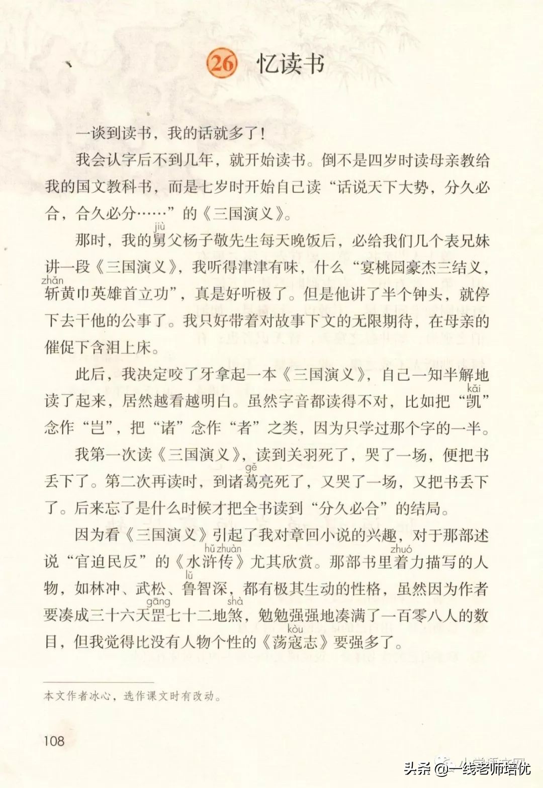 1.倒不是四岁时读母亲教给我的国文教科书,而是七岁时开始自己读的“话说天下大势,分久必合,合久必分……”的《三国演义》。