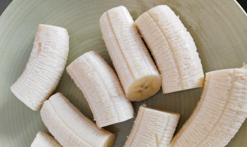把香蕉去皮后,用刀切成小段,