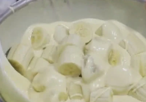 我们把香蕉段放到面糊里打个滚,让香蕉段均匀的裹上面糊,