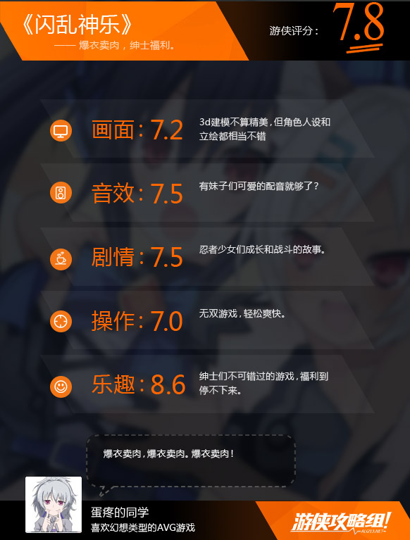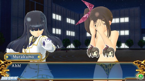 由于是移植而来的游戏,在画面上3d的人物模型并不能算精致,但是人设和立绘都挺有质量。游戏讲诉着一群忍者学校的少女们战斗,成长的故事,战斗少不了就要受伤,受伤自然就避免不了爆衣,虽然到目前为止都还是轻度绅士们驾轻就熟的套路,但在爆衣的演绎上,就开始让笔者吃了一惊。它比前段时间搬上PC的《超次元海王星U》来的更加直接,更加会玩。不仅在爆衣的过程中给出了各个角度的特写镜头,而且不会让角色的衣服一次性就完全爆开;先是上身,然后是裙子,最后甚至爆衣到需要打上马赛克,才能出现在玩家们的视线中。真是一个大写的服。