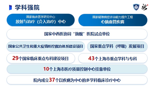 学科综合实力出众。医院在心脏、肝脏、肾脏、肺脏、消化道、泛血管等领域的临床能力处于国内顶尖、世界先进水平。医院以优势学科辐射带动多个高质量的特色学科群协同并进,拥有心脏病全国重点实验室、国家临床医学研究中心——放射与治疗(介入治疗)中心、国家自然科学基金委基础科学中心——泛血管介入复杂系统、国家疑难病症诊治能力提升工程——心脑血管疾病、国家工程研究中心——免疫治疗(筹)等多个高能级科创/诊疗平台,有其他省部级等研究平台近50个。医院有国家及上海市重点学科与专科40余个,院内成立了近40个以疾病为中心的多学科临床诊疗中心。