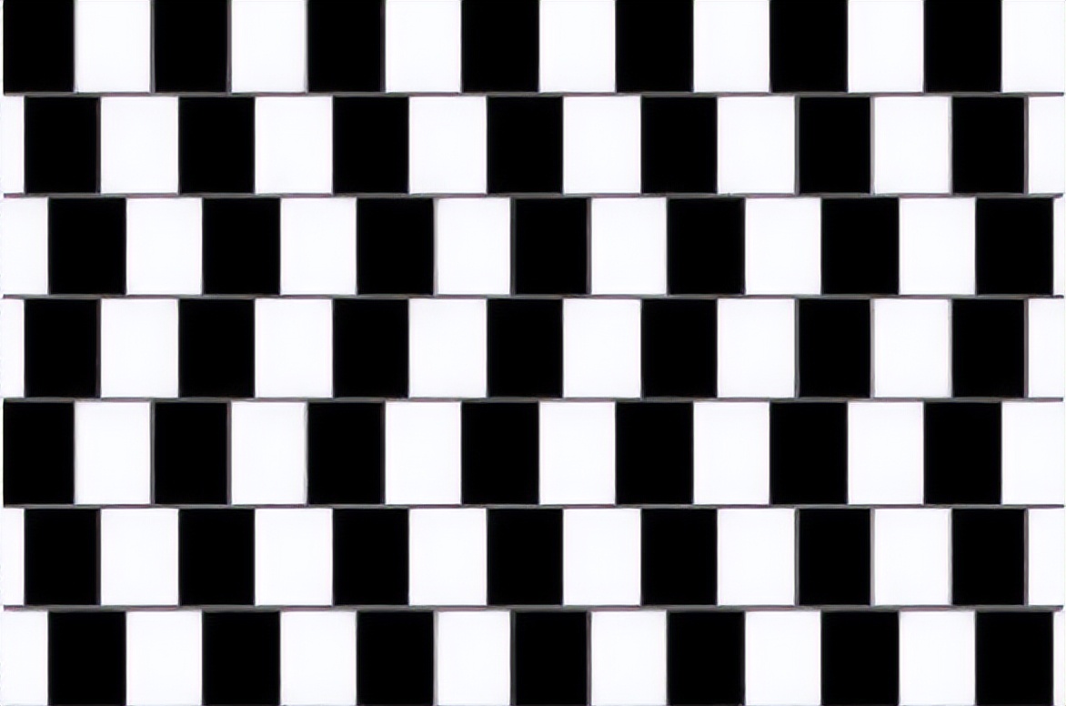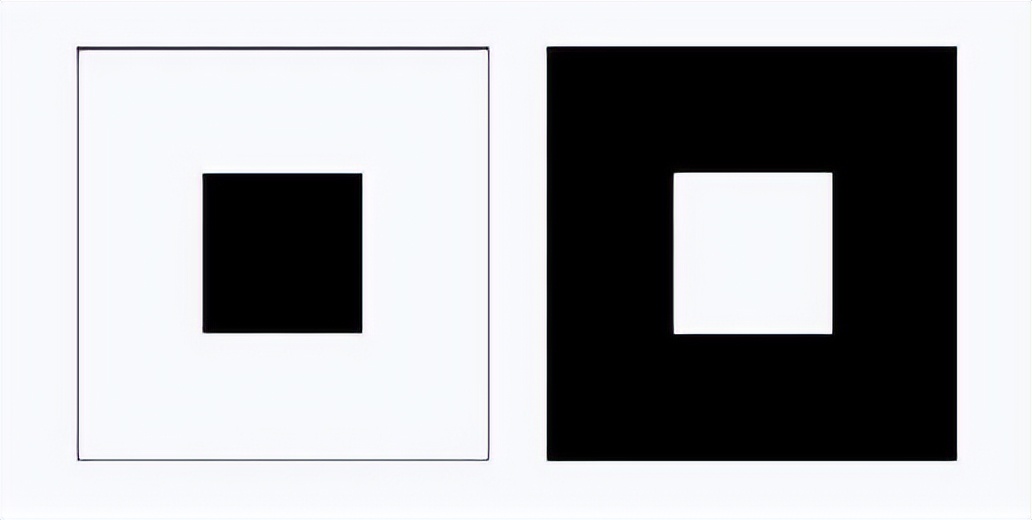 这样的视觉错误还有很多种,如图3所示。这些视觉错误会影响人们对距离、大小的判断。如图3所示,人们往往会觉得中心白色块比黑色块大。如图3所示,人们往往会觉得中间的灰线是斜的。这就是色彩的膨胀感与收缩感。