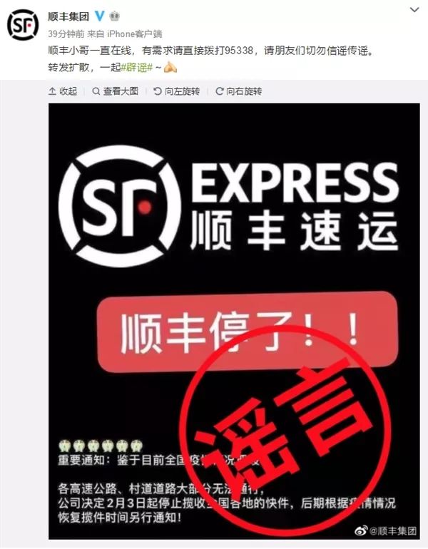 这则消息称,顺丰下发重要通知,鉴于目前全国疫情情况严重,各高速公路、村道道路大部分无法通行,公司决定2月3日起停止揽收全国各地的快件,后期根据疫情情况恢复揽件时间另行通知。