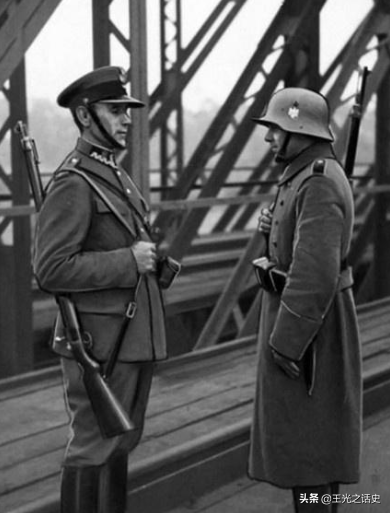 1938年,根据《慕尼黑协议》,捷克被波兰与德国瓜分(左为波兰军人,右为德国军人)