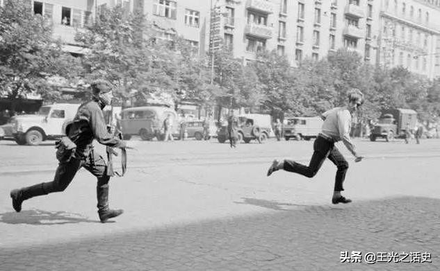 布拉格之春中,一个捷克青年朝苏军士兵投掷石块后被追逐
