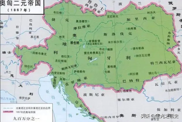 1806年,拿破仑战争如同狂风扫落叶,一举击溃了松松垮垮、江河日下的神罗帝国。神罗皇帝弗兰茨很无奈,只能退而求其次,缩回了自己的老家奥地利。1867年为了防止叛乱,继续缩水和匈牙利帝国组成联盟,也就是所谓的奥匈帝国。