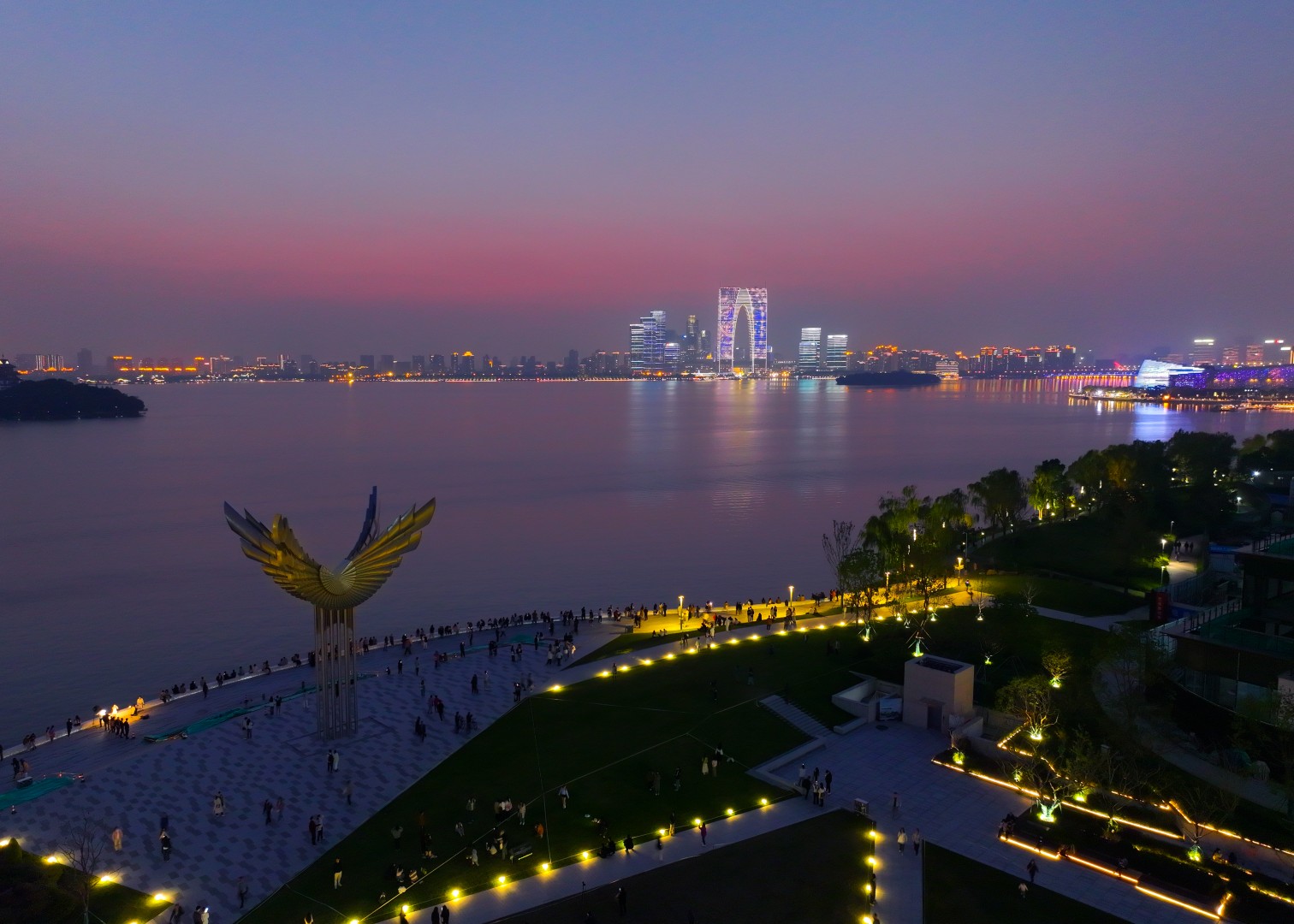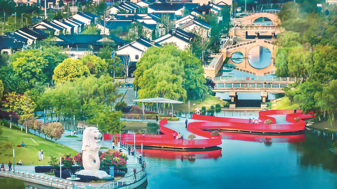 这是既有含金量又有含绿量的绿色之跃。蓝天白云下高楼耸立,清澈的湖面波光粼粼,建筑之美与生态之美交相辉映,放眼望去令人心旷神怡。“空气质量优良天数比率81.1%、PM2.5浓度30微克/立方米、太湖和阳澄湖饮用水源地及省考断面水质达标率100%,多项经验获全国全省推广……”透过2023年生态环保成绩单,园区推进绿色发展的举措与成效可见一斑。园区成立后制定的第一个法规文件,就是《建设项目环境保护管理暂行办法》,到园区投资的客商,第一道要过的就是“环保关”,园区建设15年内被环保一票否决的项目达300个。30年以来,园区始终坚持生态立区、环境立区,持续推进生态文明建设,先后获批创建首批国家生态工业示范园区、国家循环经济试点园区、首批低碳工业园区试点园区、首批国家绿色园区、国家级能源互联网示范园区,获评江苏首批唯一“双碳”重大科技示范工程,建成全国首个市场化碳普惠交易体系,在高质量发展中绘就人与自然和谐共融、双向奔赴的美丽画卷。