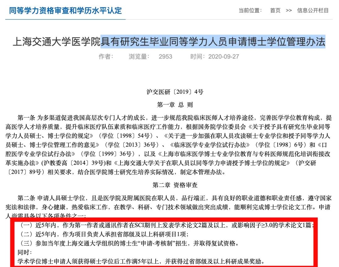2023年10月,上海交通大学医学院公布的具有研究生毕业同等学力人员申请博士学位管理规定中,对于同等学力博士资格审核第五条为:申请学术学位博士者须获得硕士学位后工作满5年以上,并获得过省部级及以上科研成果奖励。
