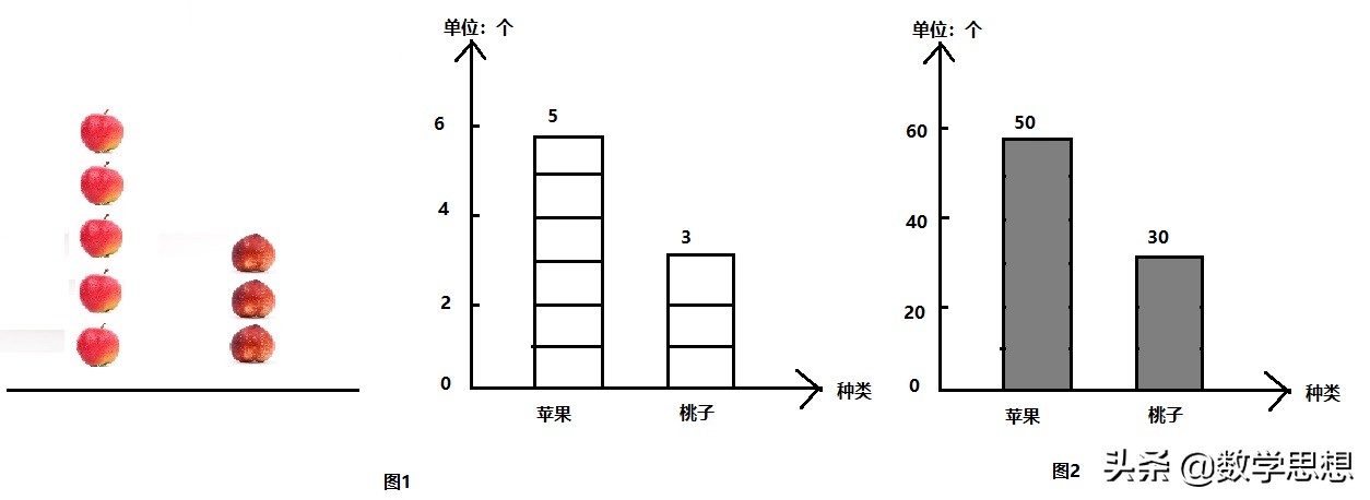 由象形图到条形图的演变是一次抽象,在这次演变的教学过程中应放慢节奏,使学生真切感知条形图的“细部特征”。例如,把一个个苹果图片翻过来变成长方形卡片、把一个个桃子图片翻过来也变成长方形卡片,提出如何区分的问题,从而引出标注类别的必要性。再提出:苹果和桃子的个数原来可以看出来,现在怎么办?怎样仍然容易看出苹果、桃子的数量和它们相差多少?从而引出确定单位长、标注数据、计量单位……再由统计表呈现大数目的条形统计图(如图1、图2),使学生认识到条形统计图直观和简洁的特点。