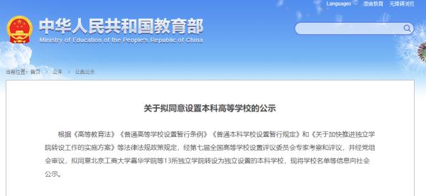 6月4日,教育部网站发布关于拟同意设置本科高等学校的公示,消息指出,拟同意全国13所独立学院转设为独立设置的本科学校。其中,云南艺术学院文华学院转设为昆明传媒学院。现将学校名单等信息向社会公示。