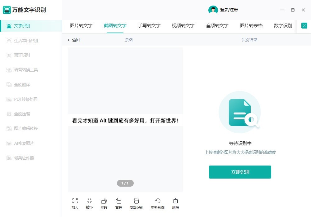 如果想要对截屏的画面进行识别文字,我们可以使用识别工具——万能文字识别来识别提取文字内容。它支持一键截图转换文字,也可以上传图片进行转文字操作。使用“Alt+F”键即可将屏幕快速截图并导入到软件中进行识别。