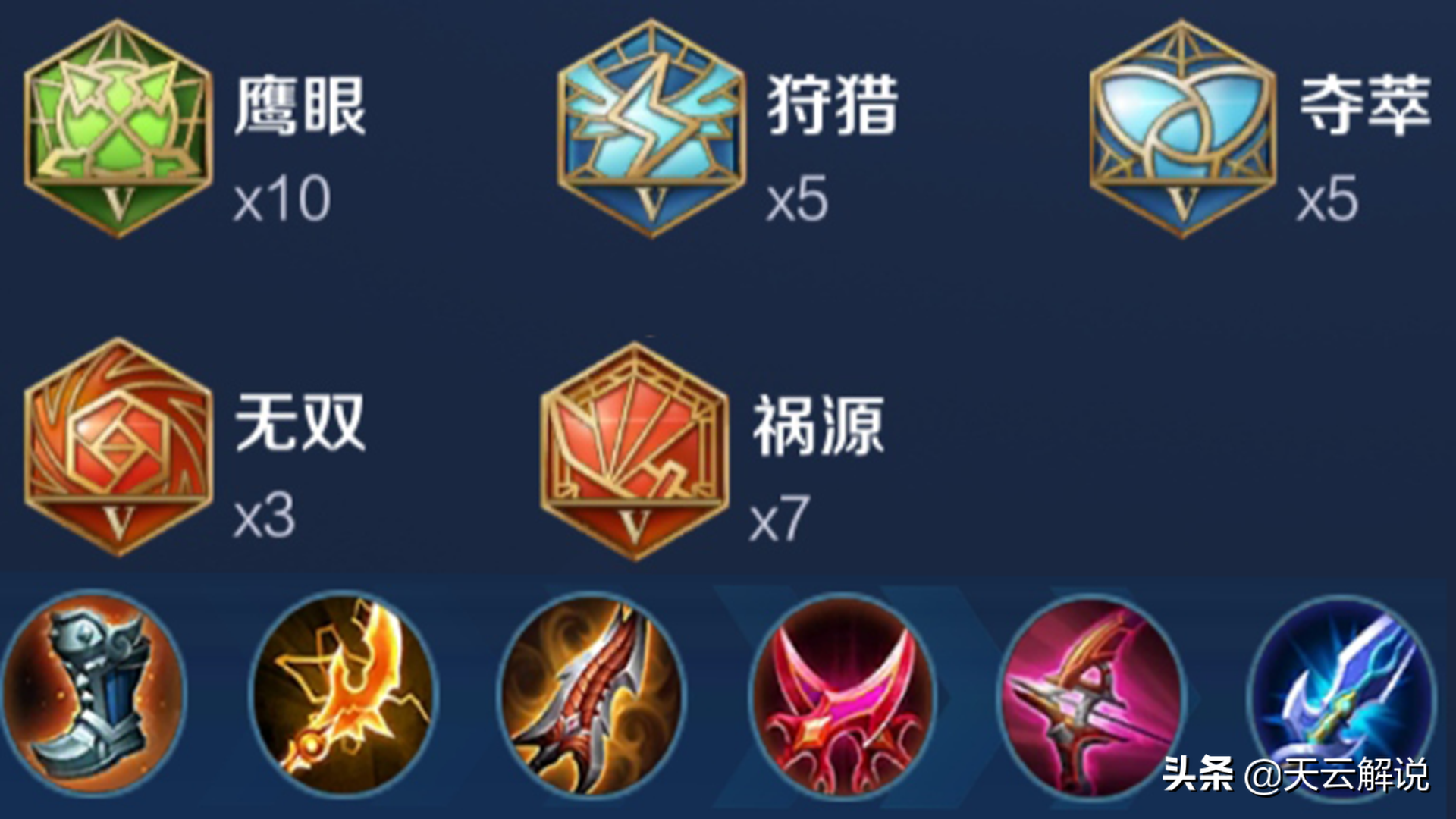 在铭文方面伽罗出了无尽战刃,为了不让自身的暴击效果上限溢出,所以选择三无双七祸源是标配选择,蓝色方面夺萃增加伽罗的续航,狩猎增加移速和攻速这都是伽罗所需要的,最后鹰眼带十个增加物理穿透。