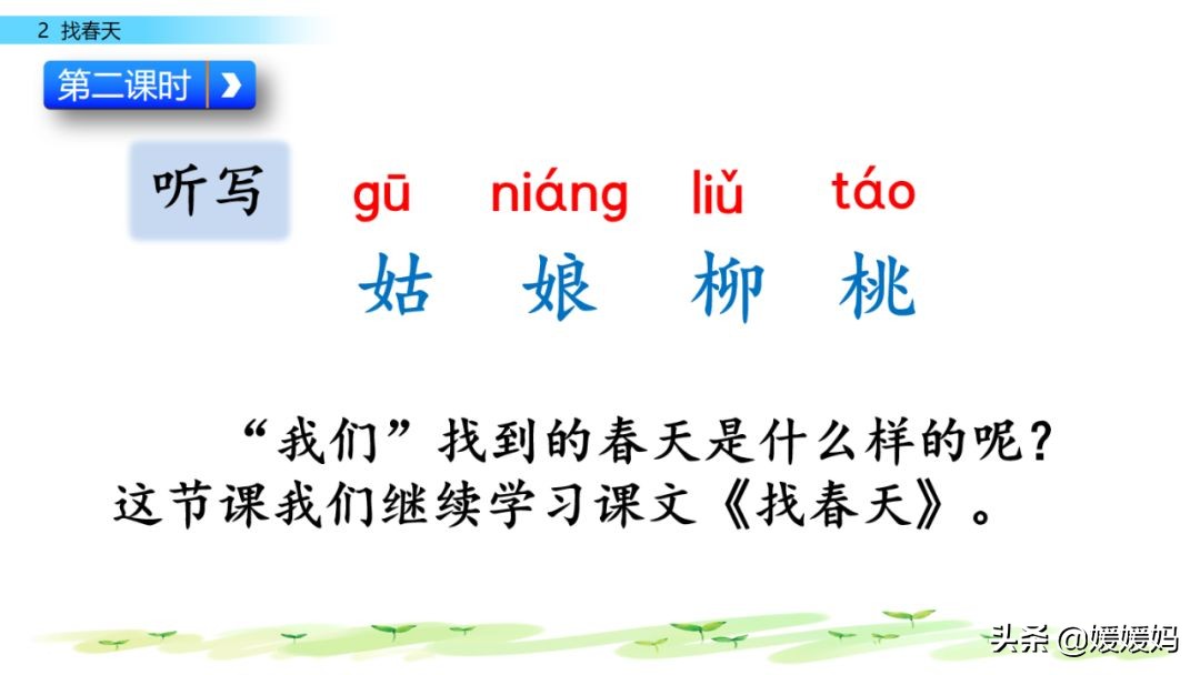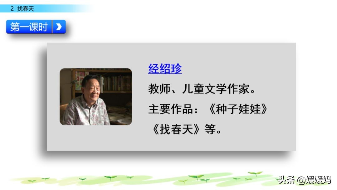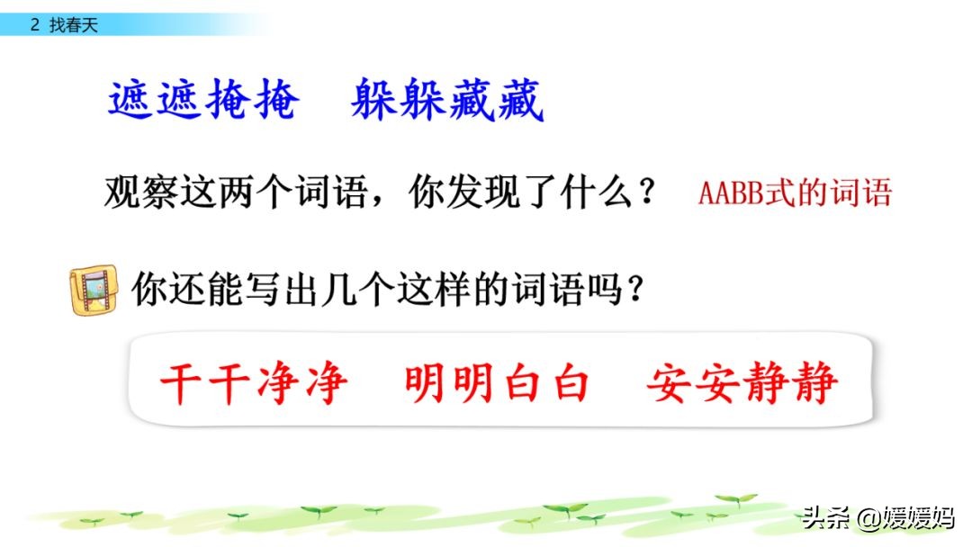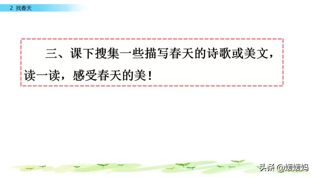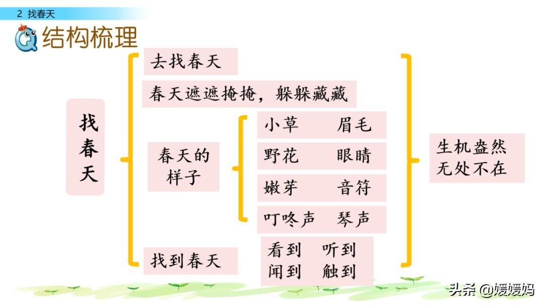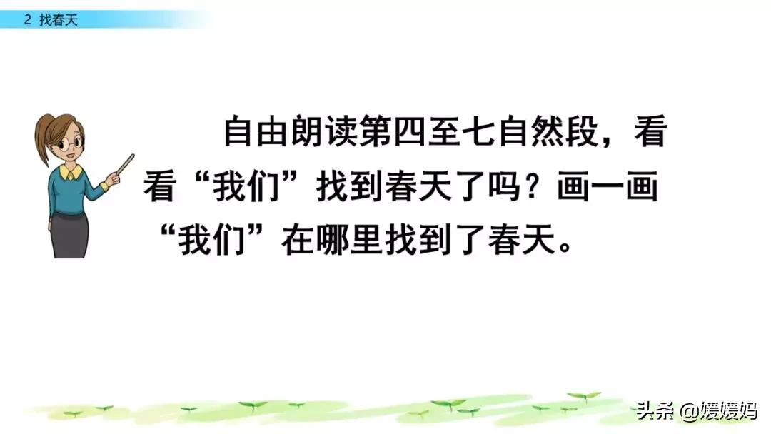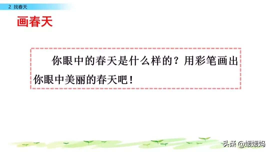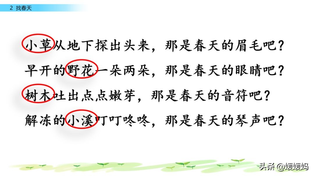 《找春天》是一篇语言优美、充满儿童情趣的散文。一个“找”字,说明春天的景象尚没有完全显露出来,是早春时节。早春的景象与仲春、暮春有所不同,文中可以看到:“小草从地下探出头来”“早开的野花一朵两朵”“树木吐出点点嫩芽”“解冻的小溪叮叮咚咚”,都在暗示春天刚刚开始,还没到春光烂漫的时候。