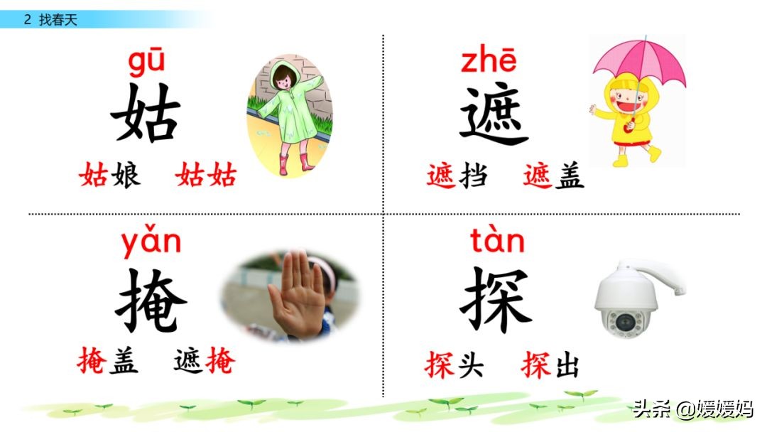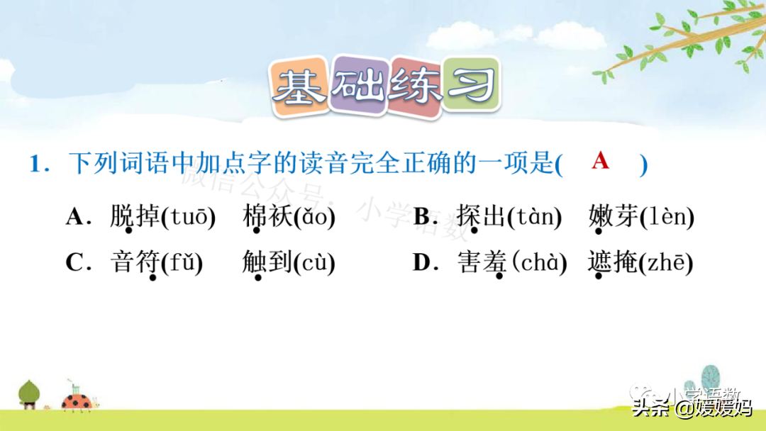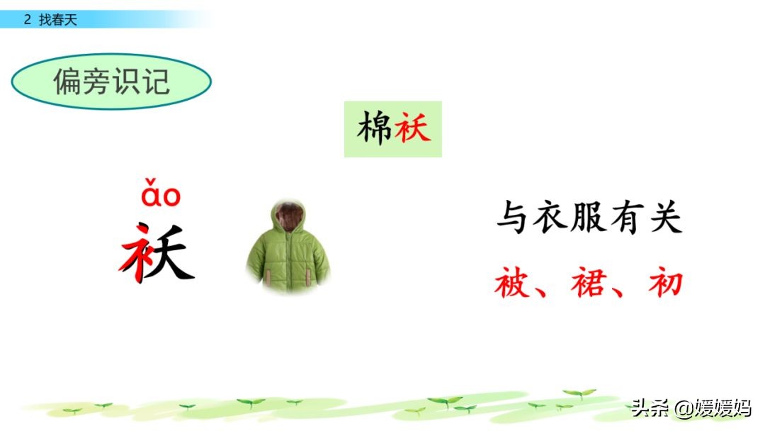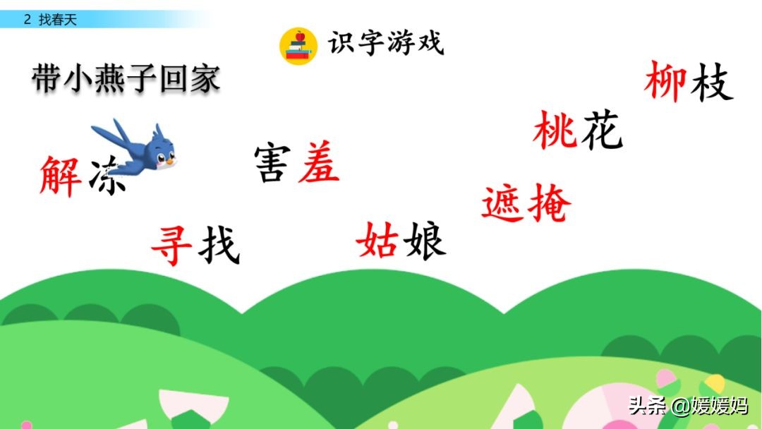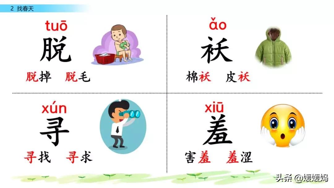 我会认:脱:tuō(脱掉、脱衣、逃脱)袄:ǎo(棉袄、皮袄、夹袄)羞:xiū(害羞、羞耻、羞答答)遮:zhē(遮挡、遮蔽、遮掩)掩:yǎn(掩护、掩埋、遮遮掩掩)探:tàn(探出、探子、打探)嫩:nèn(嫩绿、嫩叶、嫩芽)符:fú(符号、音符、符合)解:jiě(解冻、解开、解气)触:chù(触动、接触、触角)杜:dù(杜鹃、杜绝、杜梨)鹃:juān(杜鹃、杜鹃花)