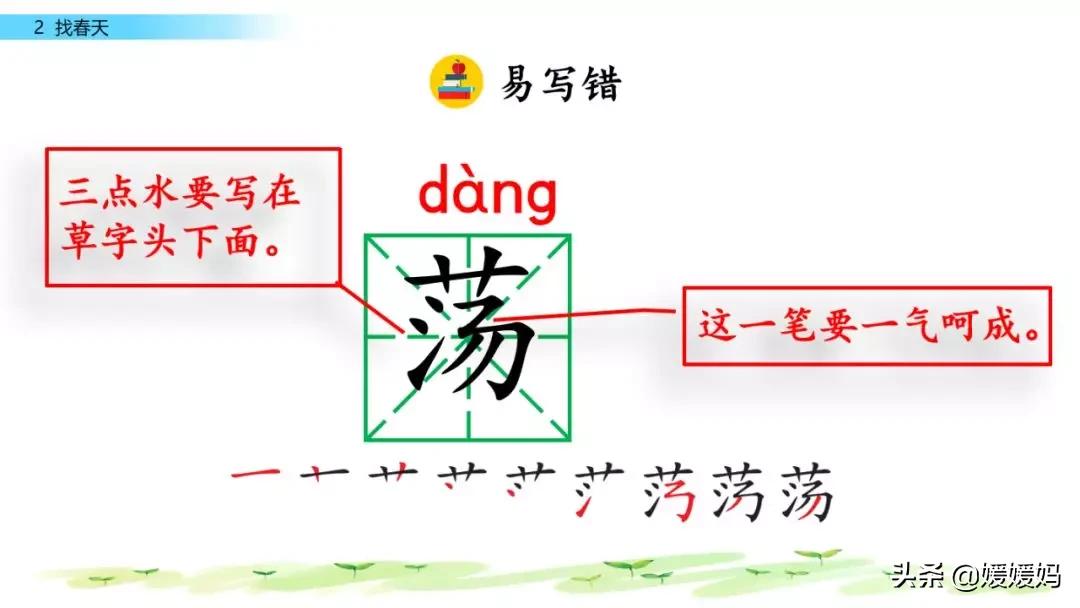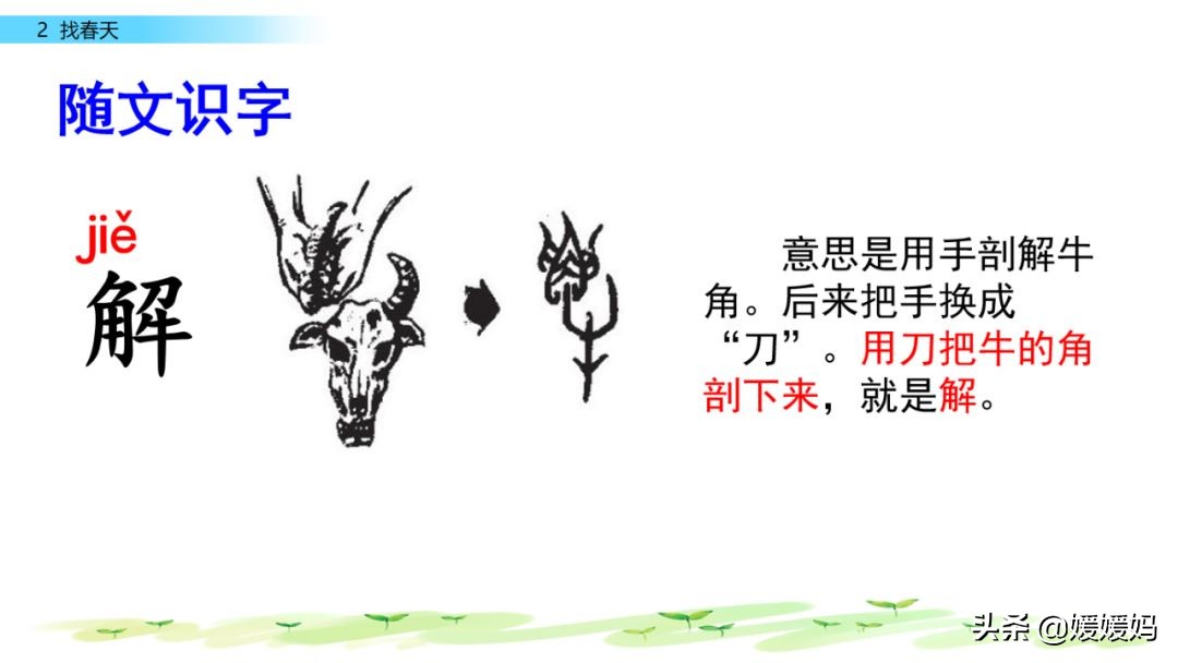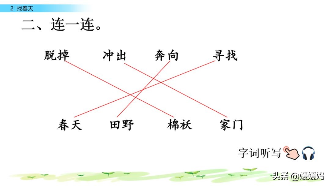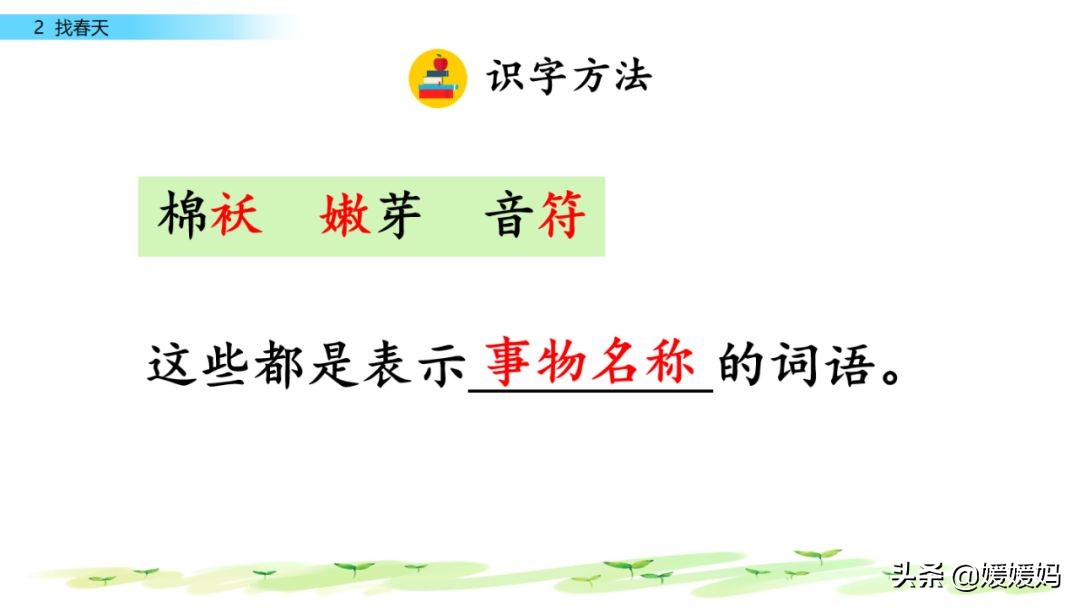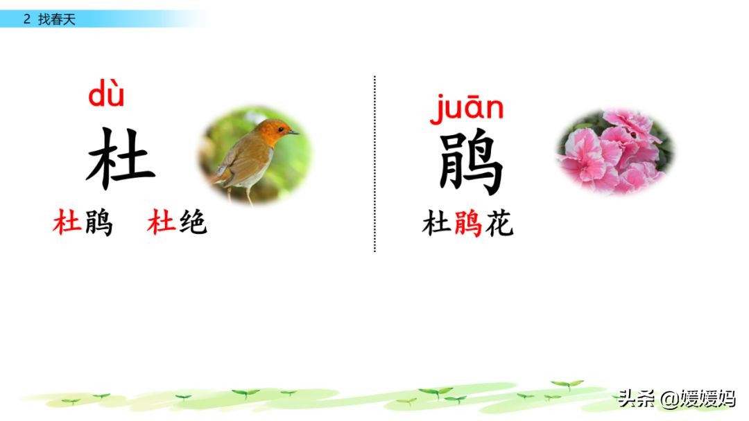 我会认:脱:tuō(脱掉、脱衣、逃脱)袄:ǎo(棉袄、皮袄、夹袄)羞:xiū(害羞、羞耻、羞答答)遮:zhē(遮挡、遮蔽、遮掩)掩:yǎn(掩护、掩埋、遮遮掩掩)探:tàn(探出、探子、打探)嫩:nèn(嫩绿、嫩叶、嫩芽)符:fú(符号、音符、符合)解:jiě(解冻、解开、解气)触:chù(触动、接触、触角)杜:dù(杜鹃、杜绝、杜梨)鹃:juān(杜鹃、杜鹃花)