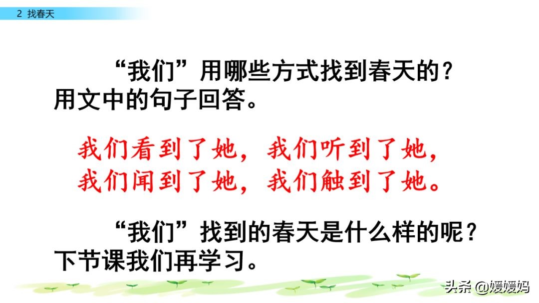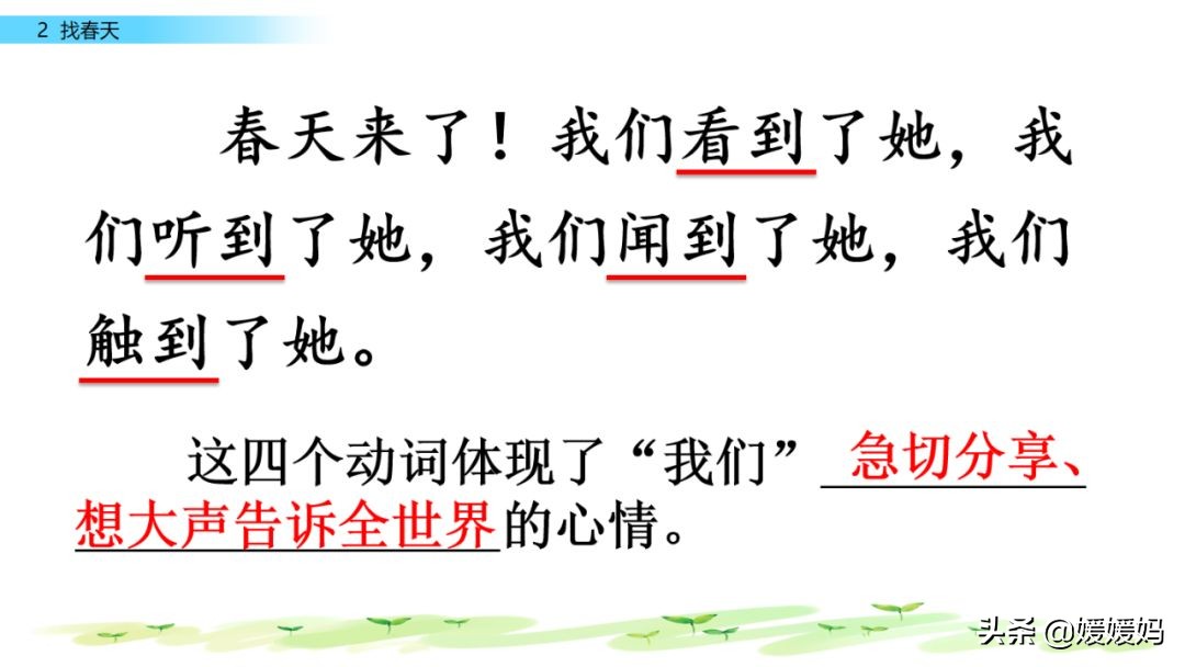最后一个自然段,“看”“听”“闻”“触”这几个动词写出“我们”是如何找到春天的,同时也说明春天是有色彩、有声音、有气味、有形体的,生动、形象。最后用省略号结尾,给人留下了想象的空间,告诉大家春天已经来到,就在我们身边,快快去寻找吧,与课题“找春天”相呼应。