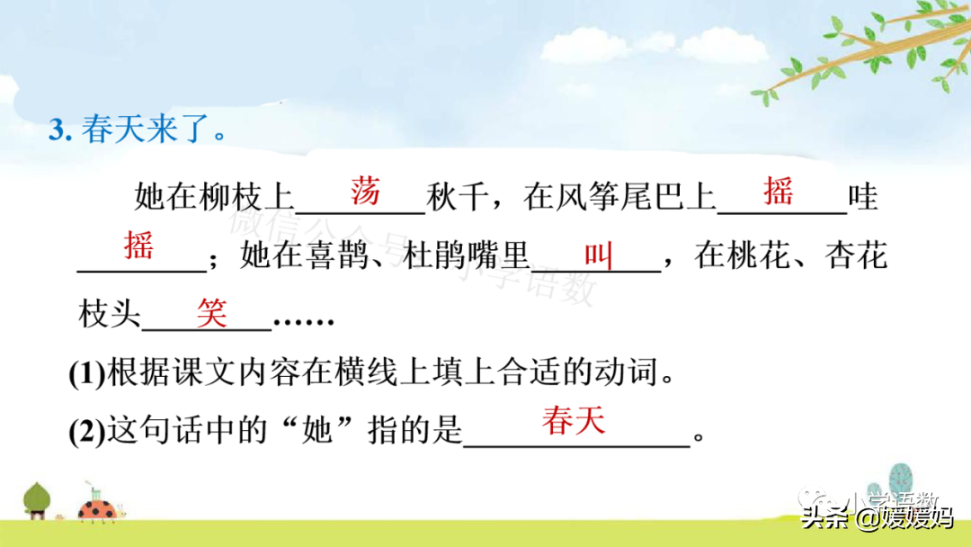 春天来了!我们 到了她,我们 到了她,我们 到了她,我们 到了她。她在 上荡秋千,在 上摇哇摇;她在 、 嘴里叫,在 、 枝头笑……