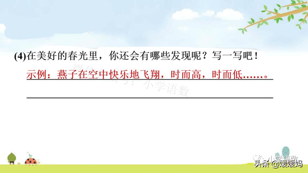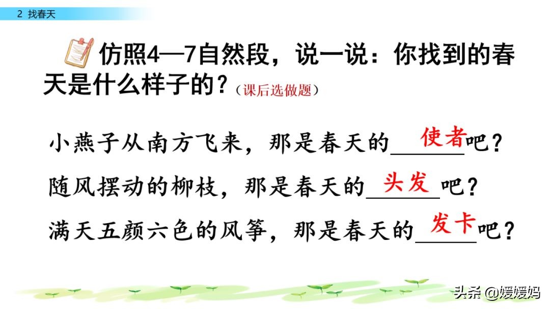 选做:你找到的春天是什么样的?仿照第4?7自然段或第8自然段说一说。