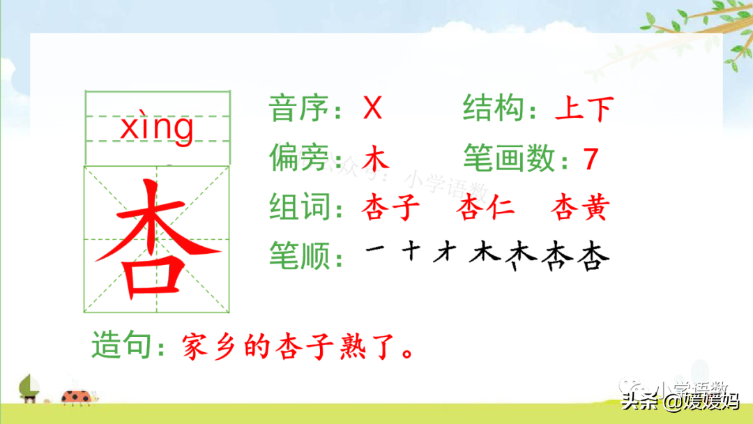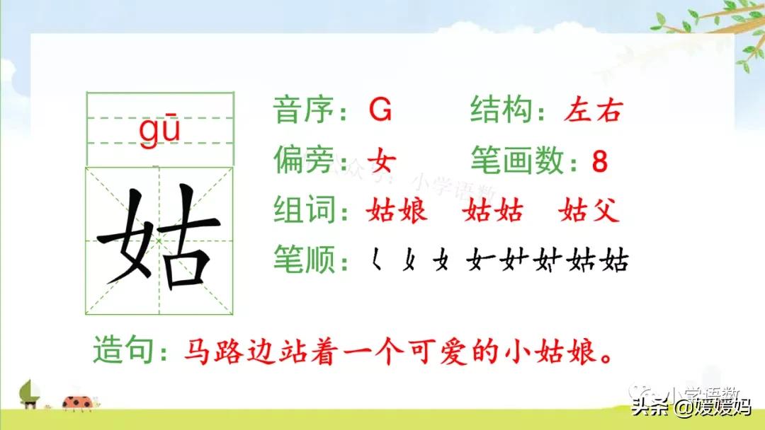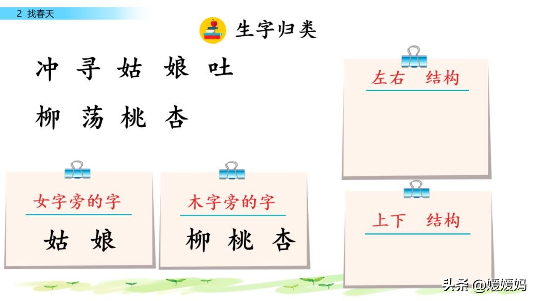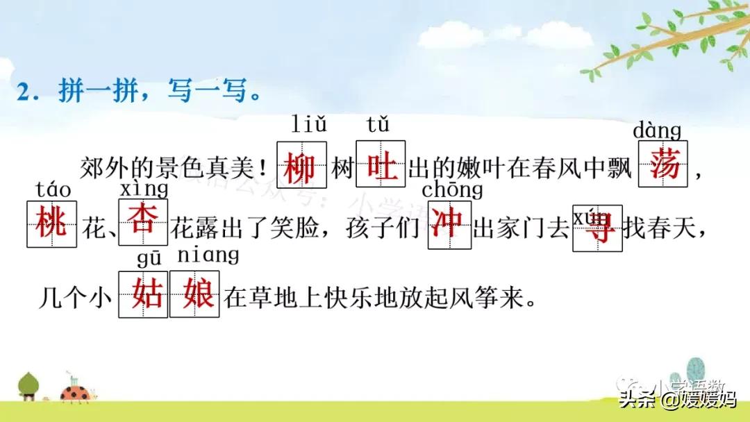 我会写:冲:chōng(冲出、冲动、冲破) 寻:xún(寻找、寻问、寻访) 姑:gū(姑姑、姑娘、尼姑) 娘:niáng(姑娘、大娘、娘亲) 吐:tǔ(吞吐、吐出、谈吐) 柳:liǔ(柳树、柳叶、柳枝)荡:dàng(荡起、摇荡、荡秋千) 桃:táo(桃树、桃花、桃子) 杏:xìng(杏花、杏子、杏仁)