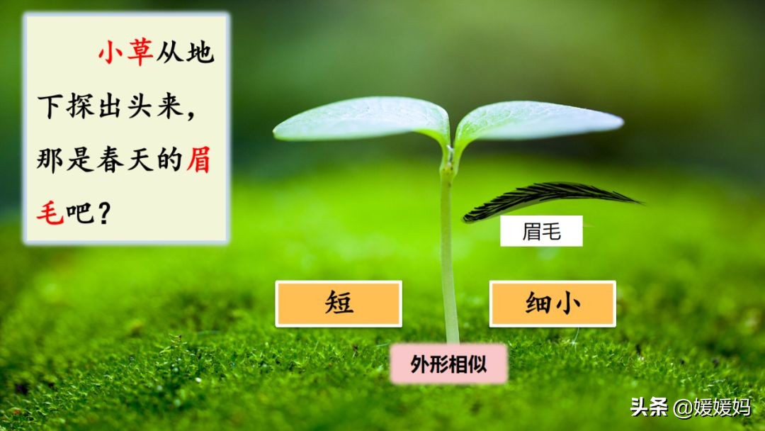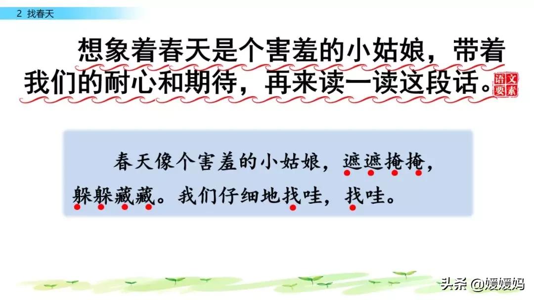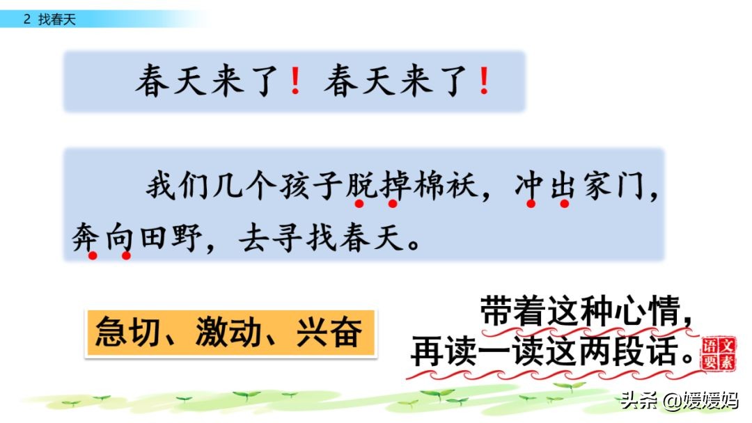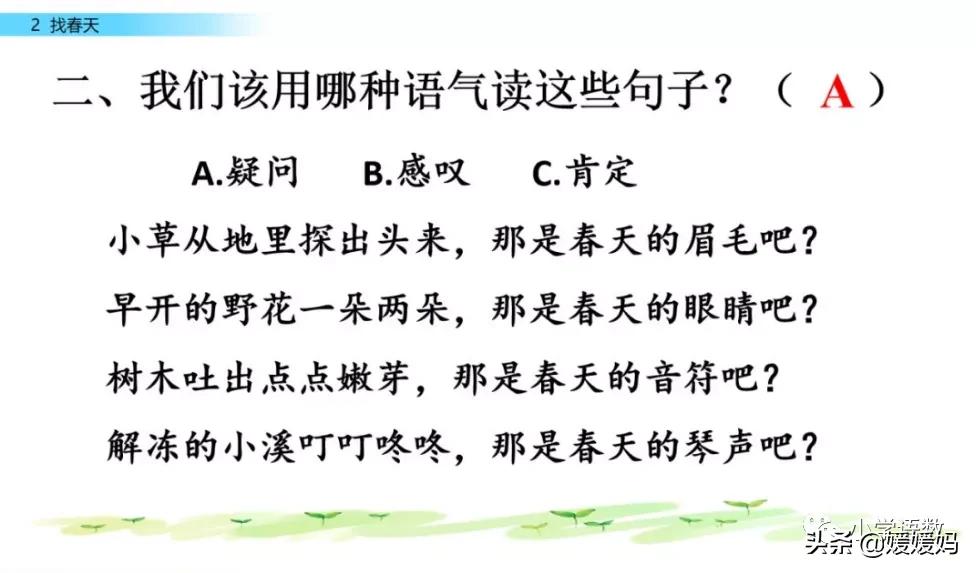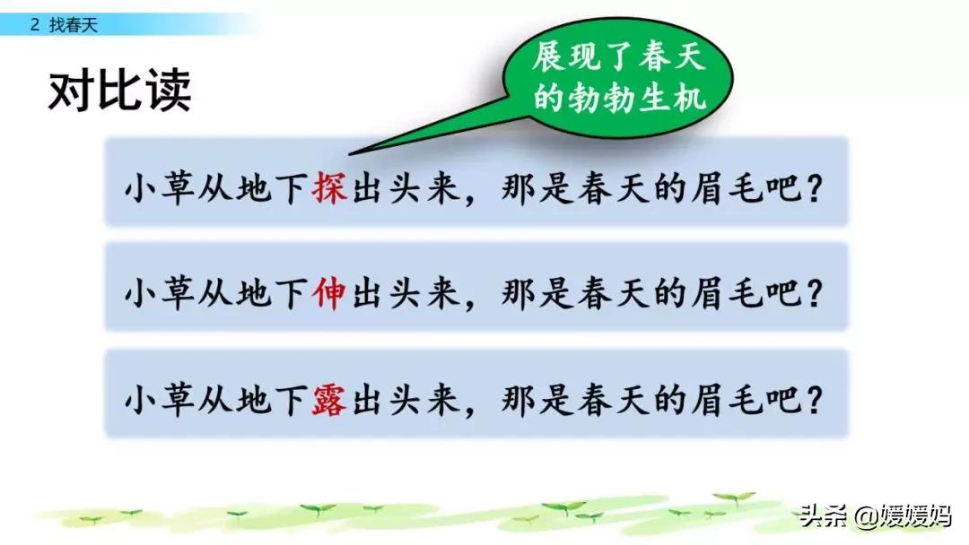 第一句话中,“探”字把“小草”写活了,“眉毛”写出了春天的生机。朗读时把小草当成一个调皮的孩子,用上扬的语调把春天灵动的气息读出来。