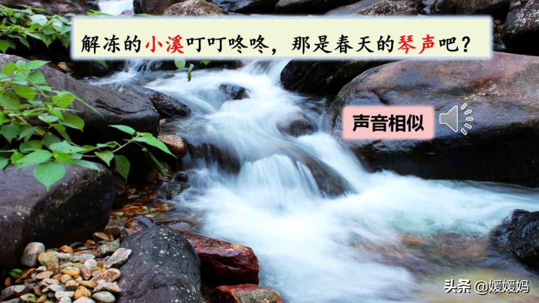 3.解冻的小溪丁丁冬冬,那是春天的琴声吧?“丁丁冬冬” 象声词,表现了小溪解冻了,让人感到很欢快。