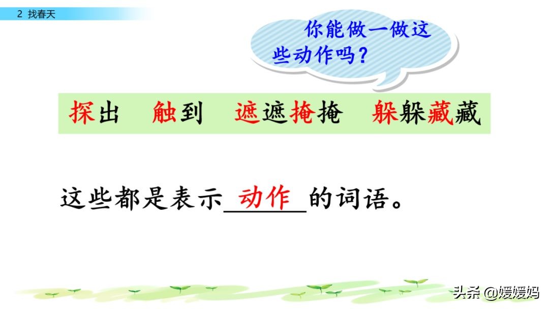 第二自然段,一连串的动词和四字短语,描绘出一幅动感十足的画面,把孩子们急不可待、像风一般寻找春天的样子刻画得生动、传神。